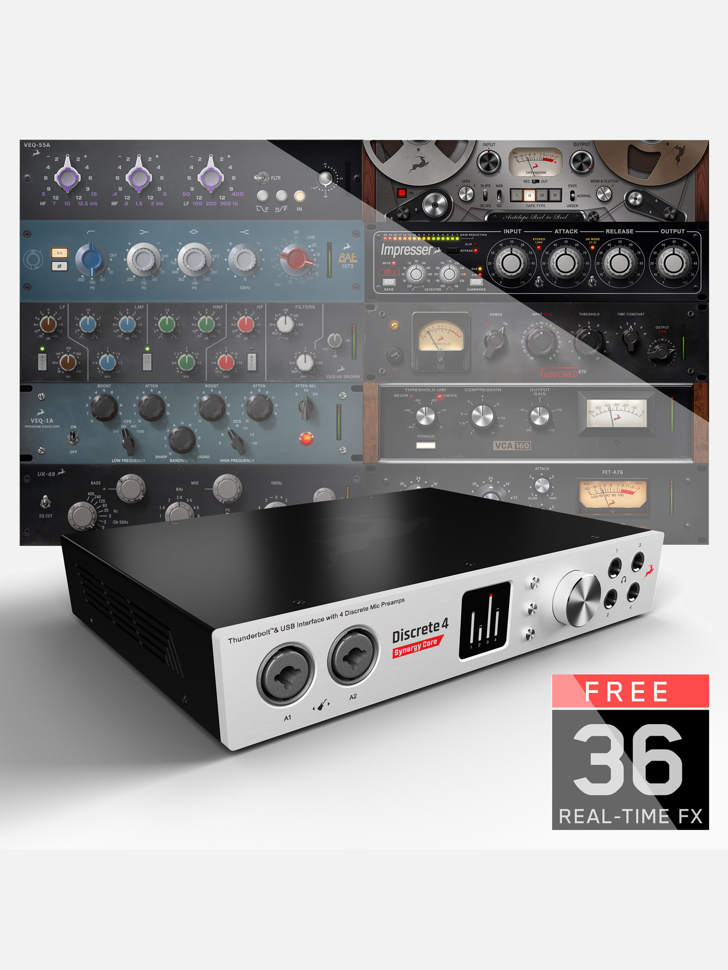 Il cuore dell’Antelope Discrete 4 Synergy Core è la sua piattaforma DSP+FPGA che consente di caricare fino a 32 effetti in tempo reale con latenza praticamente nulla, senza gravare sul processore del computer. L’interfaccia include 36 effetti analogici modellati, tra cui compressori vintage, equalizzatori, preamp classici e amplificatori, tutti utilizzabili direttamente durante il tracking, il mix o la performance live.