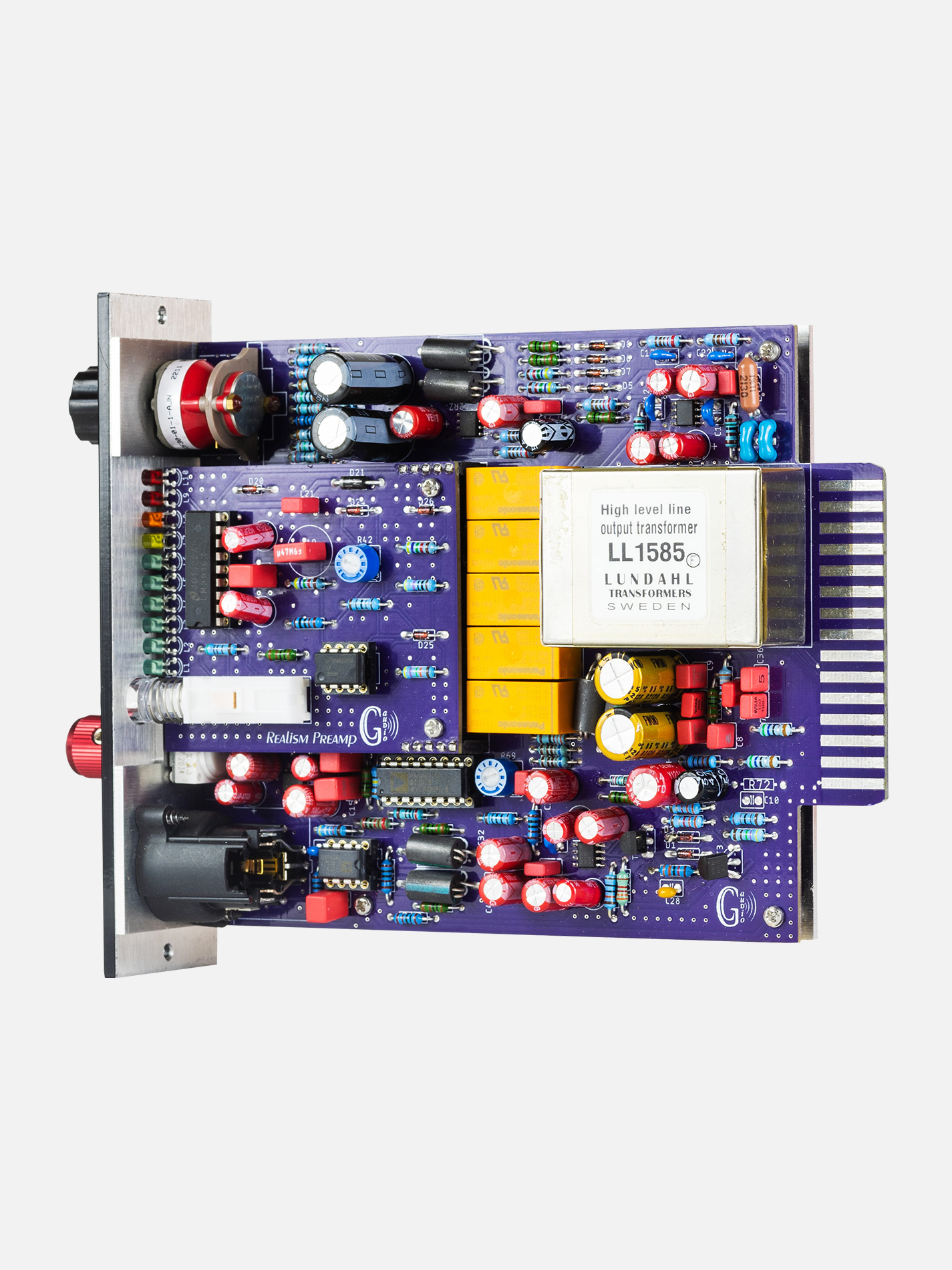 The GC Audio 500 Realism Preamp features a class A differential preamplifier composed of ultra-low noise SSM 2212 paired transistors and OPA1612 operational amplifiers, known for their quiet operation. The careful selection of capacitors, including Wima plastics for low values and Nichicon Long Life low ESR electrolytic for higher values, ensures an optimized impulse response.